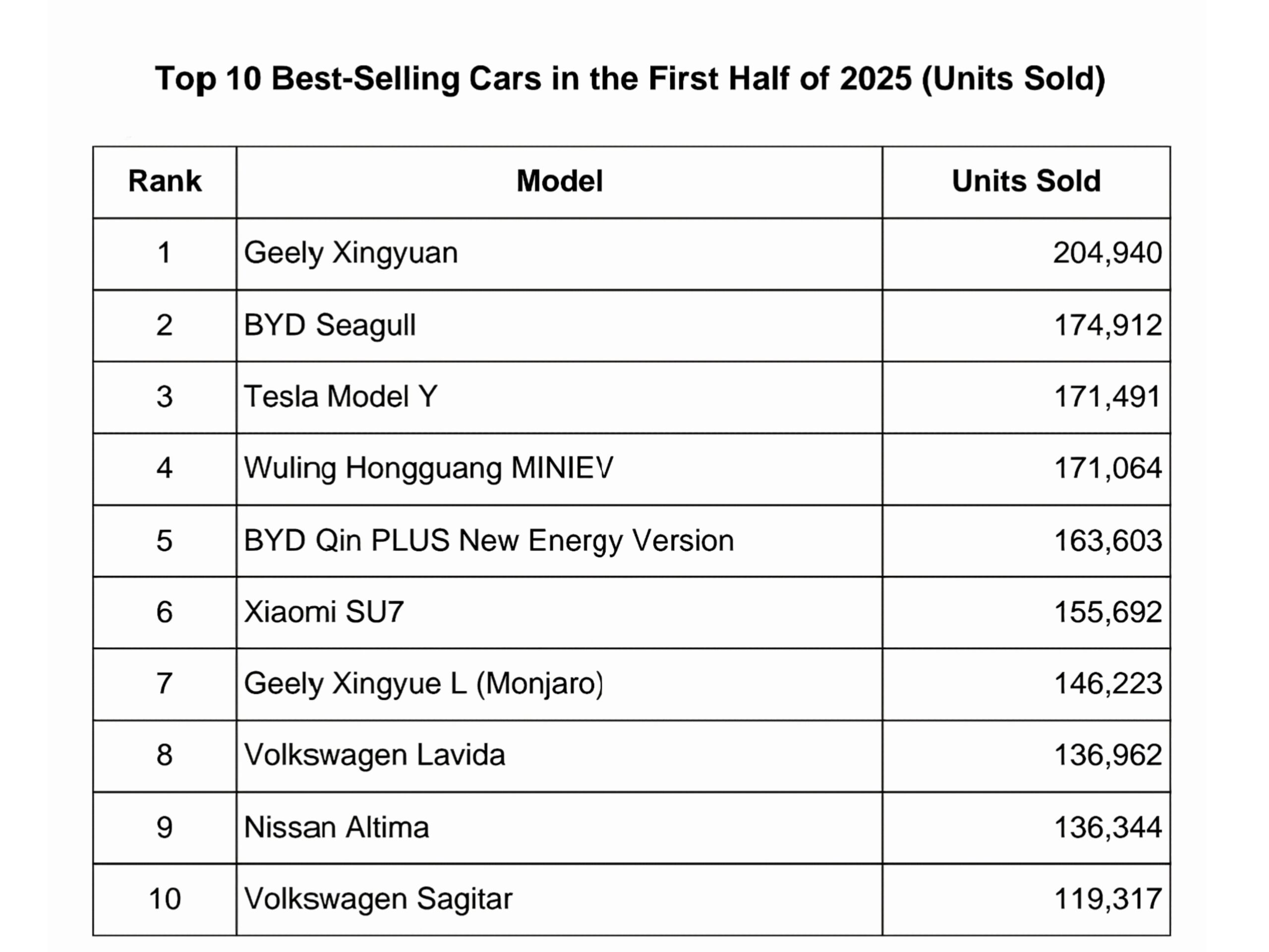 China’s Car Market Heats Up: Top 10 Best-Sellers in H1 2025 Revealed
