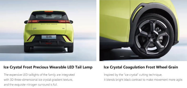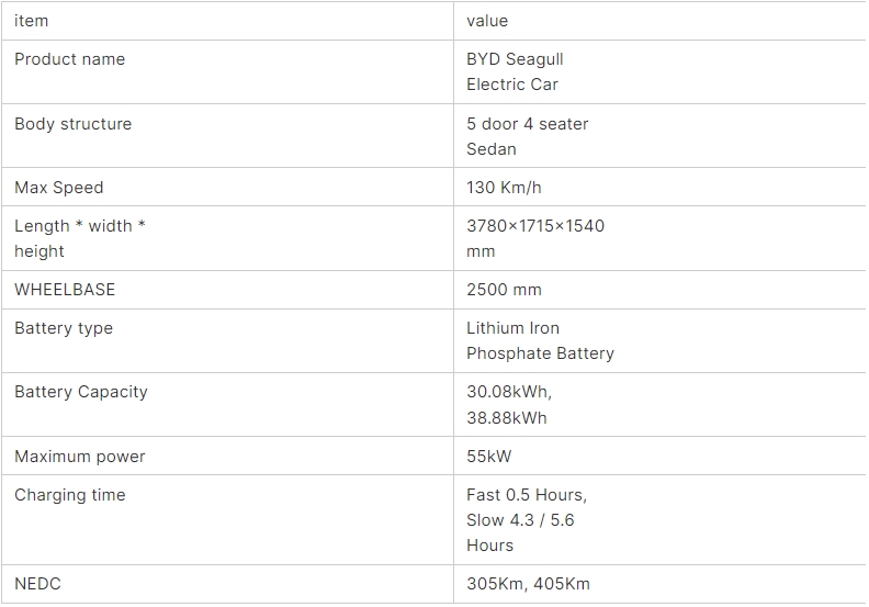 BYD Seagull EV 5 Seats L&W&H:3780*1715*1540 mm Wheelbase:2500 mm Motor:Front Mounted Power:55 Kw,135Nm Battery:30.08Kwh Range:305 kilometers CLTC Top speed:130 km/h 0-50 km/h:4.9 secs
