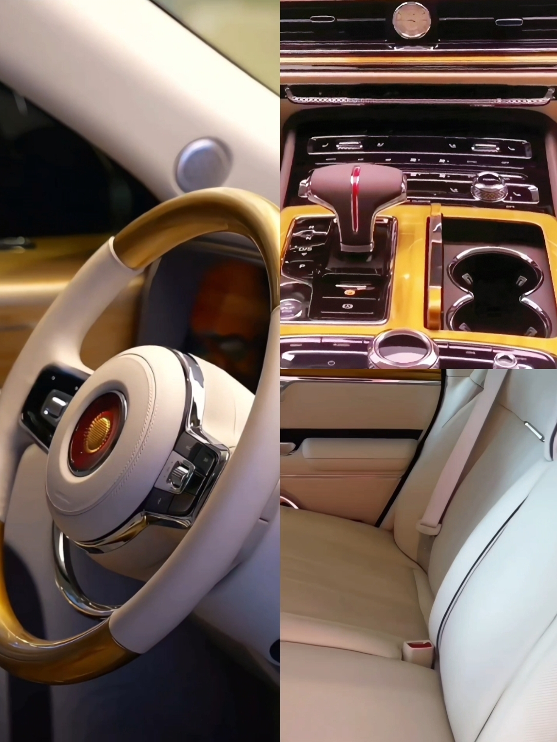 Premium leather upholstery complemented by fine wood trims, traditional lacquerwork, gold-infused detailing, and intricate wooden inlays.