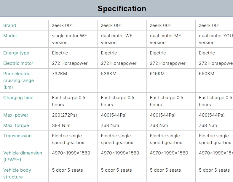 ZEEKR 001 EV CAR L&W&H:4970*1990*1560 mm Wheelbase:3000 mm Motor:Rear Mounted Power:310 Kw,440Nm Battery:100Kwh Range:750 kilometers CLTC Top speed:240 km/h 0-100 km/h:5.9 secs